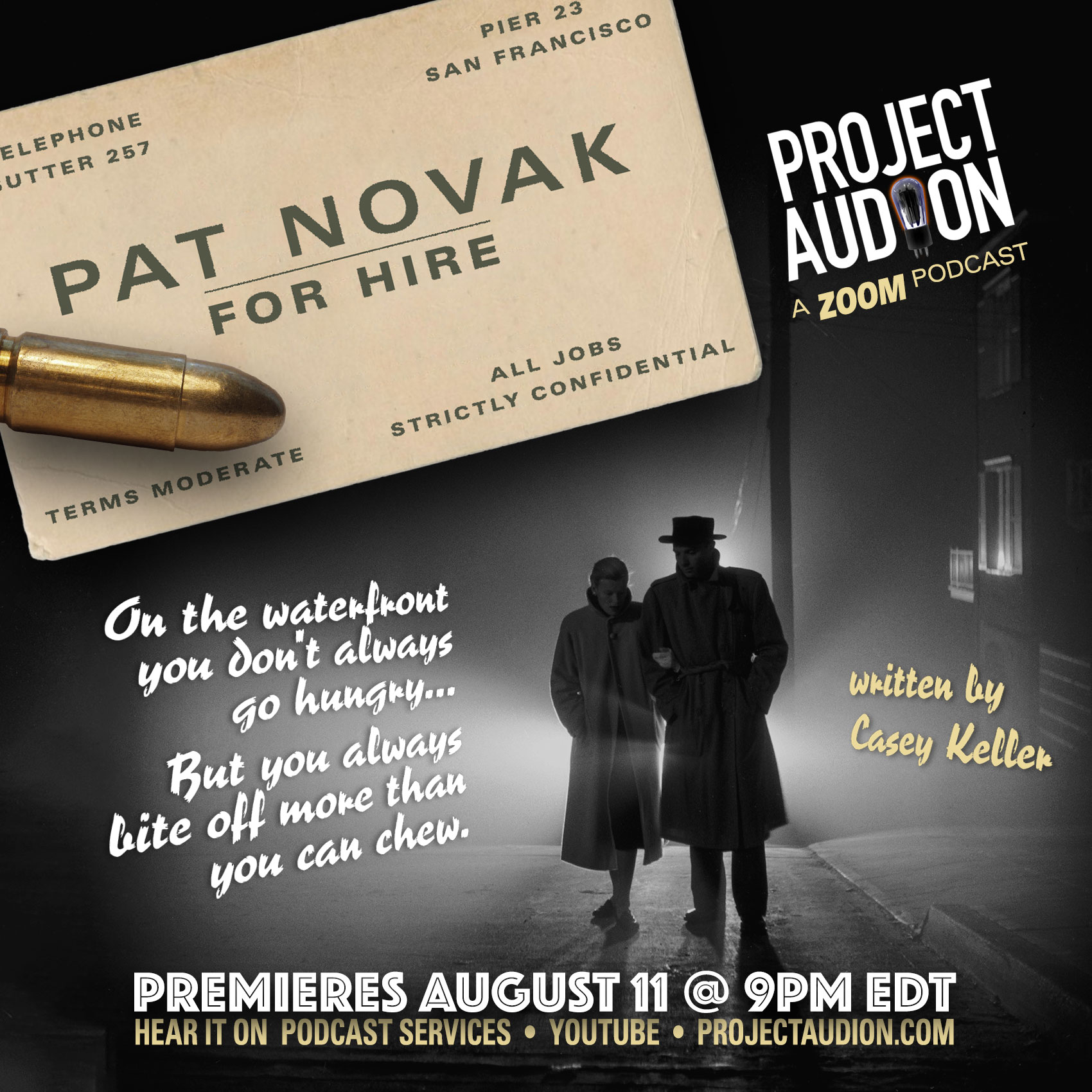 The short-lived noirish radio detective series "Pat Novak for Hire" is probably better loved now than it was in the late 1940s, thanks to its darkly-comic quips and the dry-as-dust performance of Jack Webb in the title role, just before his breakout turn on "Dragnet." Pat Novak - the man, like the show - was one of those "hard-boiled" types - he may bounce or crack, but he doesn't break easily. Pat Novak shows are famed for their Raymond Chandler-esque plots and style, where the lead character never met a crook or a lady he couldn't describe with a delirious simile. Project Audion presents a brand-new episode penned for Project Audion by long-time network television writer Casey Keller. Mr Keller's script matches the late-1940s originals blow for blow, dame for dame, gunshot for gunshot, metaphor for metaphor. Step out of the summer heat and into the perpetual foggy night of the San Francisco waterfront to meet "Pat Novak, For Hire."