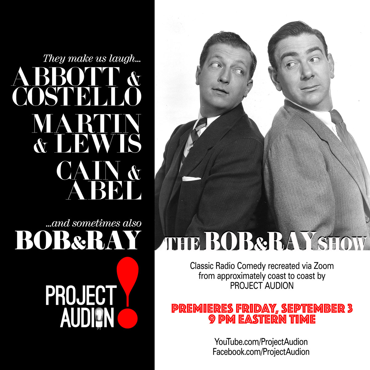 Not too many stars from the OTR era have also hosted Saturday Night Live and a Broadway show, but comic geniuses Bob & Ray did it - and so Project Audion salutes them with a recreation of the offbeat, deadpan humor that aired on radio networks across the country for years starting in the early 1950s. John Bell in Alabama, and Pete Lutz in Texas take on the many characters created by Bob Elliott and Ray Goulding in an assemblage of sketches - both familiar and obscure - designed to replicate the kind of free flowing absurdity they did so well. Larry Groebe is there as well, handling the production aspects from Dallas.