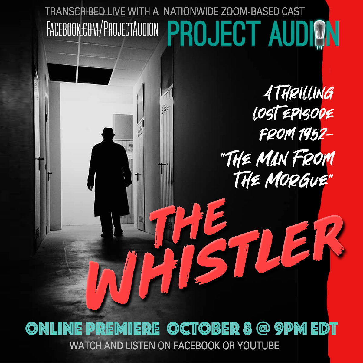 Appropriate to the Halloween month - but good anytime - Project Audion's latest premiere is an episode of old time radio's long-running (1942-1955) mystery anthology series, "The Whistler". Over 700 episodes were originally broadcast, but we're recreating one that doesn't survive: "Man from the Morgue" which aired January 13, 1952 and was since lost. Our coast-to-coast cast features outstanding performances all transcribed live via Zoom…